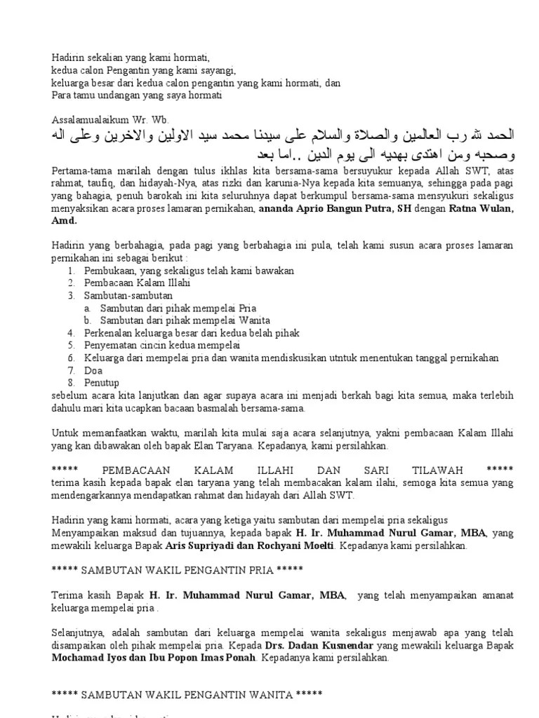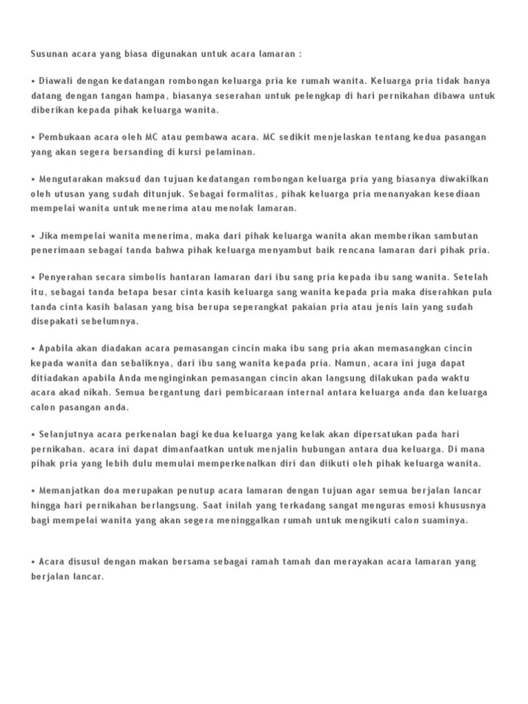 Sebab, di saat inilah, pihak keluarga pria secara resmi meminang sang mempelai perempuan untuk memasuki jenjang . Rangkaian acara yang pertama yaitu kedatangan rombongan dari calon mempelai pihak pria ke rumah calon mempelai perempuan. Menyampaikan maksud kedatangan rombongan · 4. Penyambutan kedatangan calon mempelai lelaki · 2. Contoh susunan acara lamaran sederhana · 1. Kedatangan calon mempelai pria dan rombongan · pembukaan · keluarga pria menyampaikan maksudnya · jawaban dari keluarga wanita · tukar cincin · ramah . Kedatangan keluarga besar calon mempelai pria · 2. Contoh naskah pembawa acara lamaran pernikahan. · sambutan dari pihak wanita sebagai tanda selamat datang. Mc mempersilahkan perwakilan pihak wanita untuk menanyakan. Wawan gunawan · kata sambutan perkawinan. · pembacaan doa atau ayat suci al quran. Hai semuanya.menyambung video aku yg membahas soal persiapan lamaran, kali ini aku bikinin video soal rundown atau susunan acara prosesi .